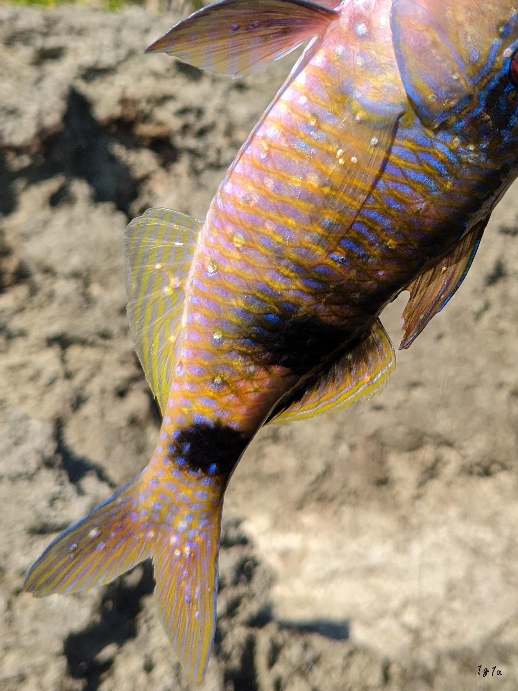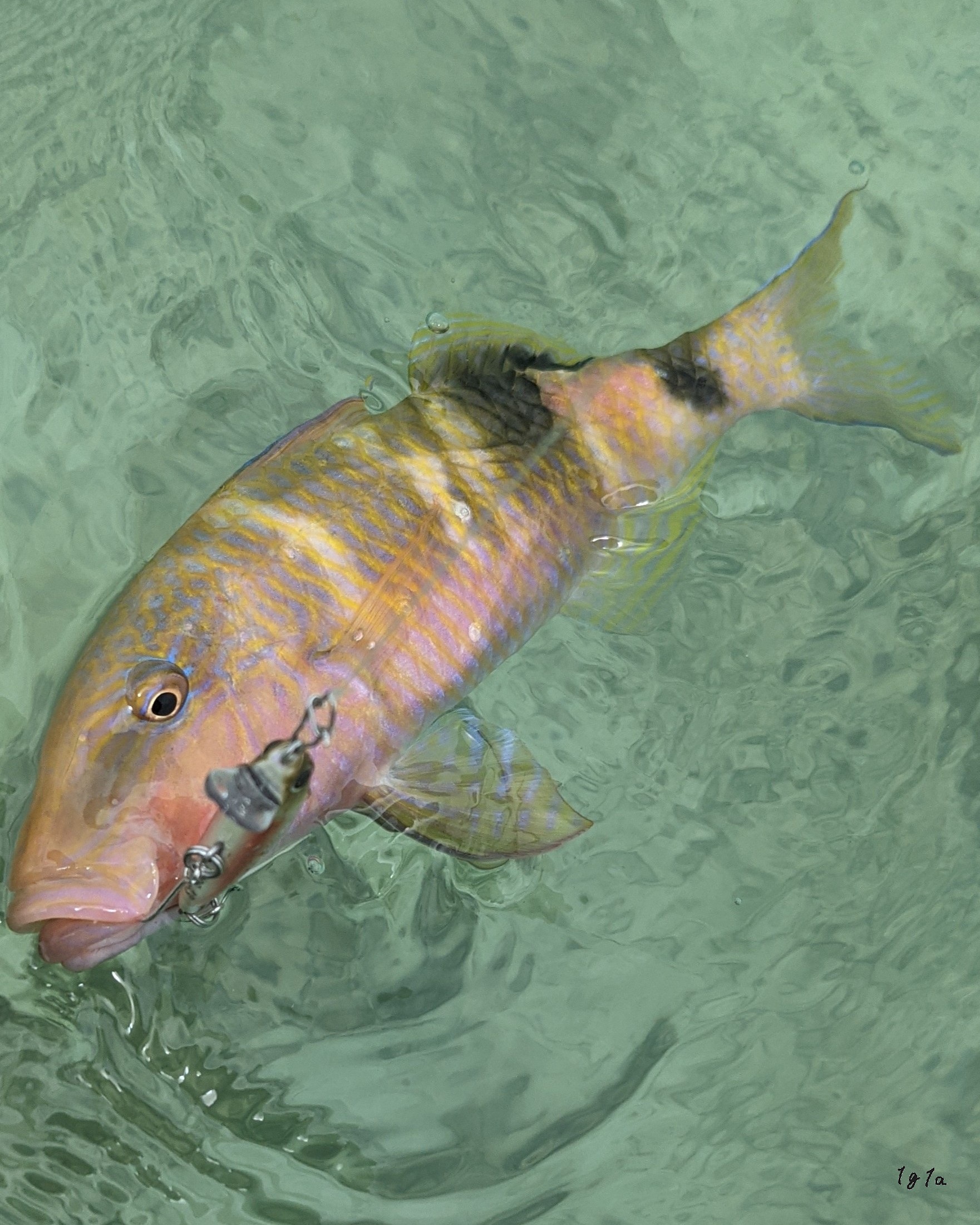 今のところの経験上、ヒメジ科(オジサンのなかま)に共通することとして、フックに掛かり、やり取りをして上がってくるころには相当体力を消耗し、フラフラになっていることが多いです。