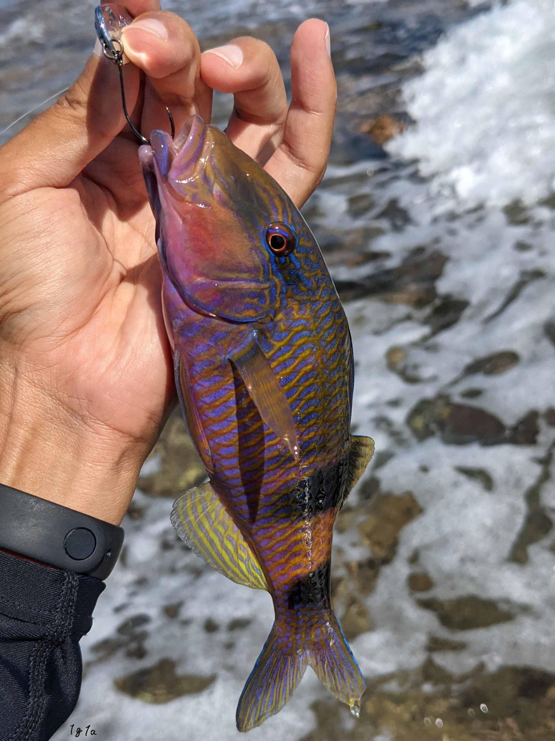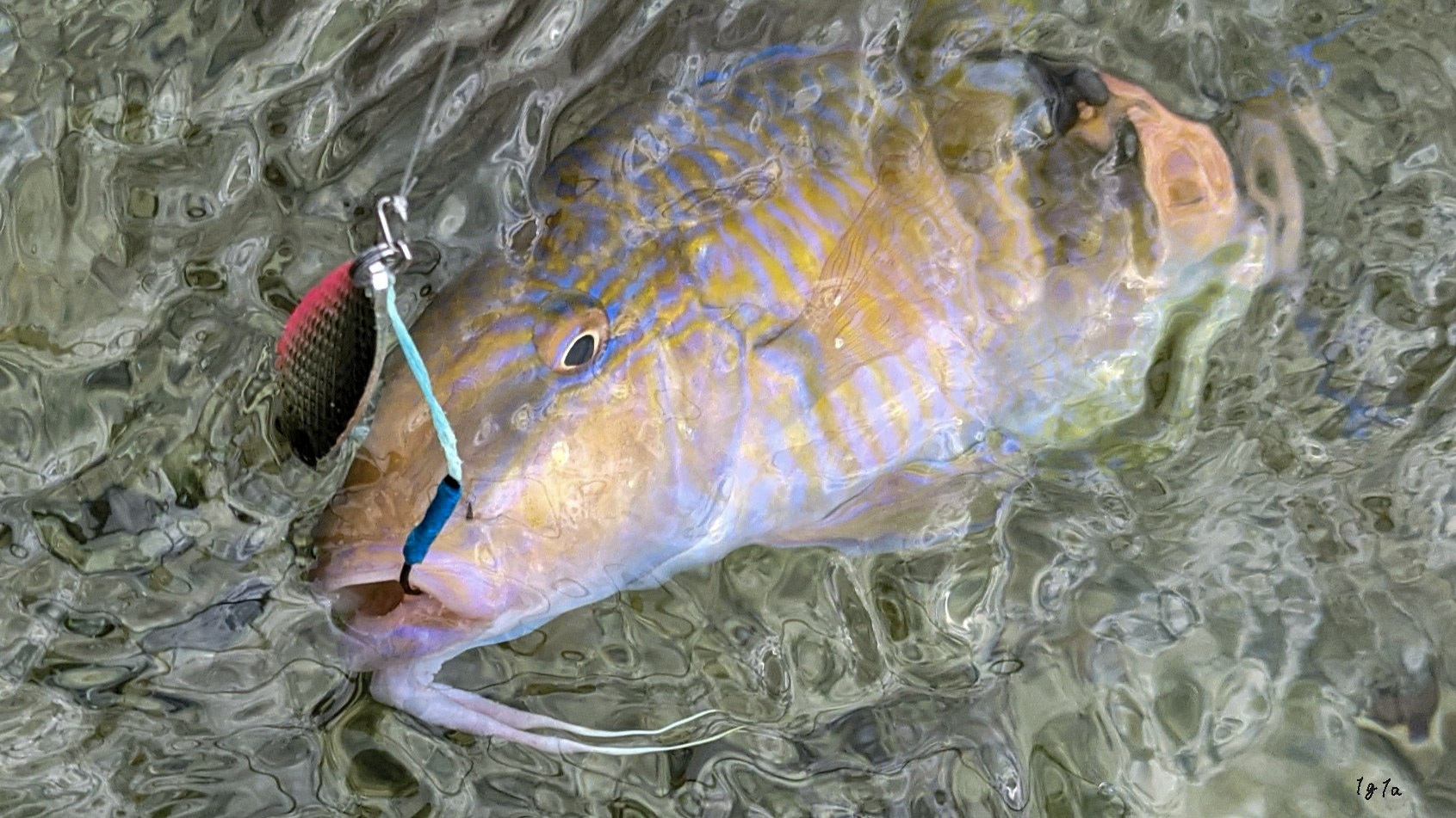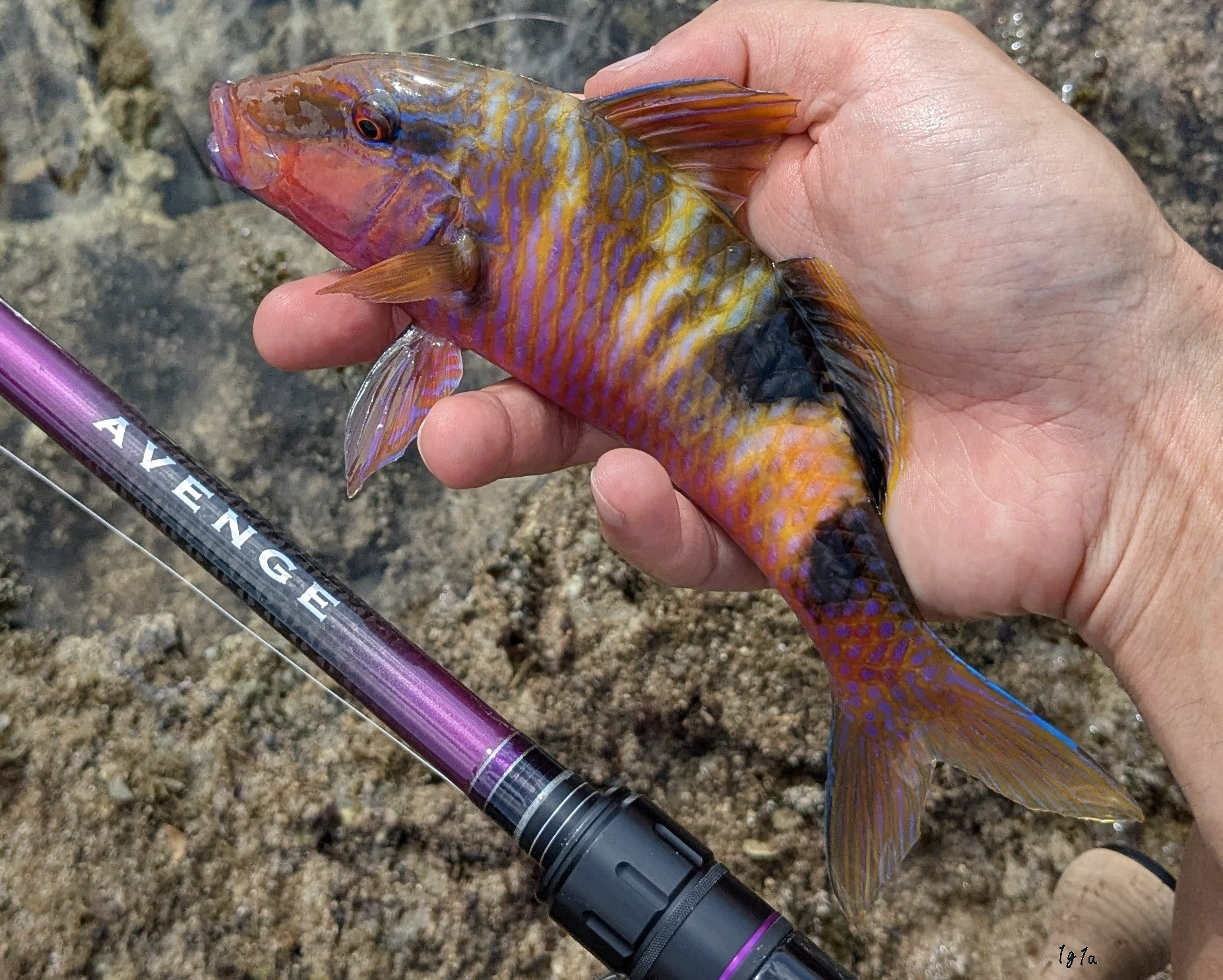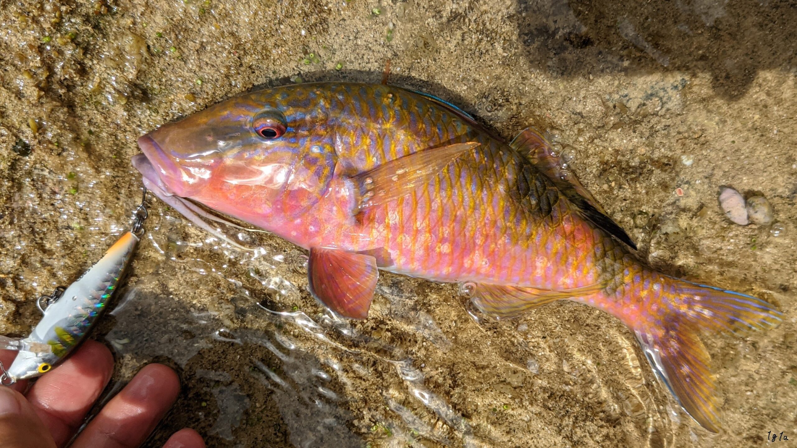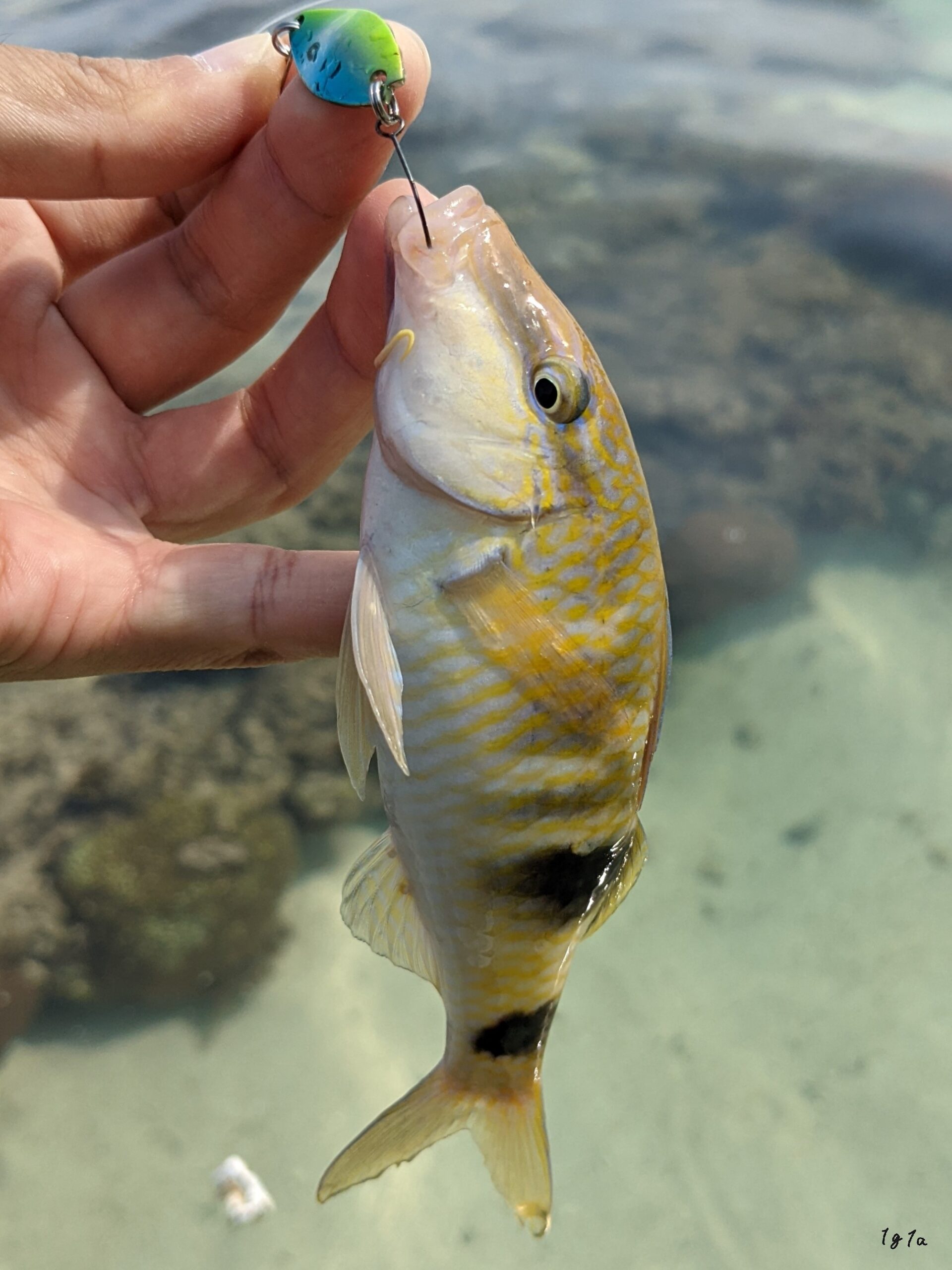 通称オジサンと呼ばれるウミヒゴイ属の仲間は他にもいますが、コバンヒメジやホウライヒメジなど、体色違いのような他の種が釣れることは結構珍しく、リーフ内だと当社比