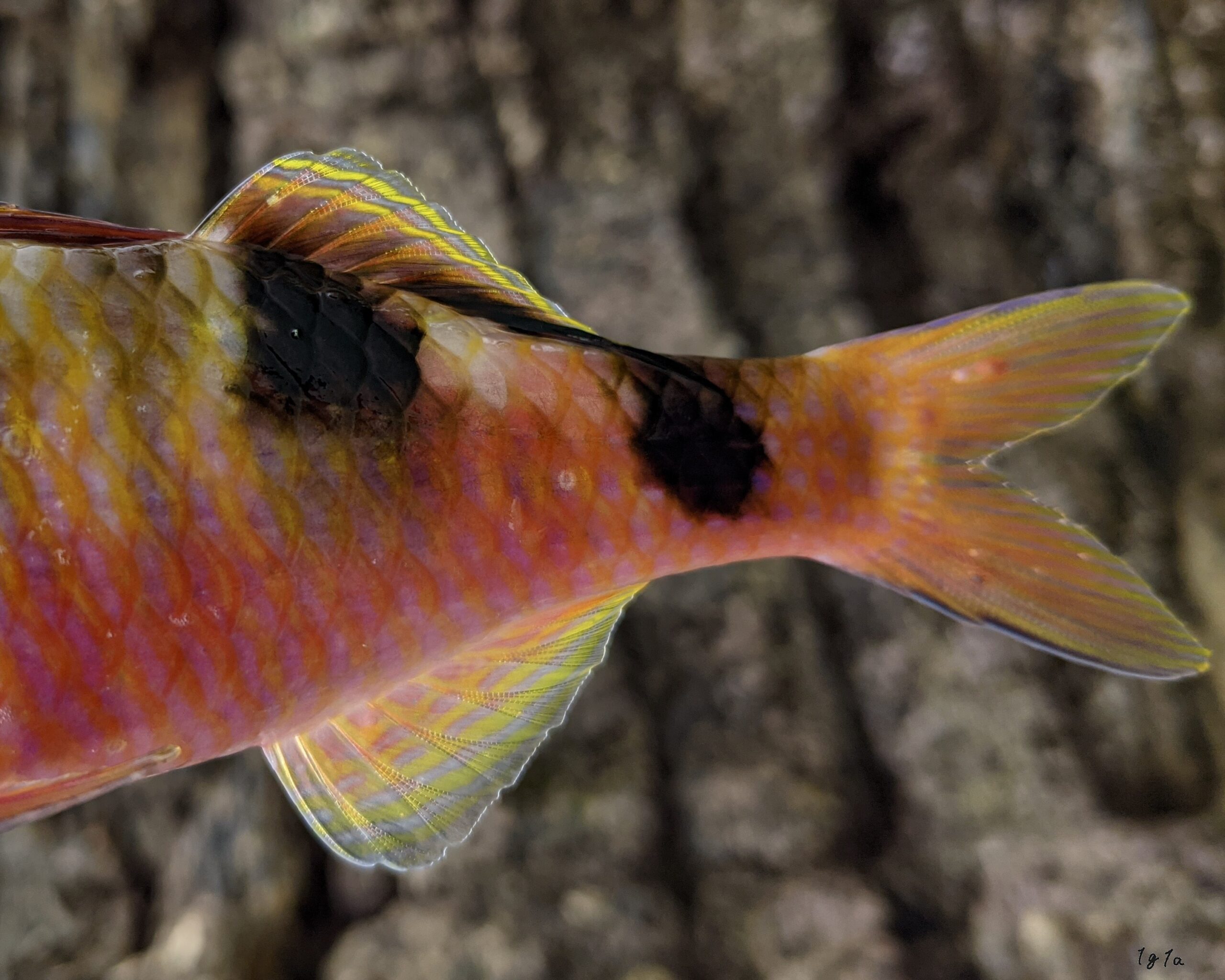 胸部~腹部には青みがかった色も混じり、第二背びれと尻びれには黄色のラインも出ます。魚体をよく観察すると、かなりカラフルで美しい色彩を持っていることが分かります。被写体としてとても魅力的。