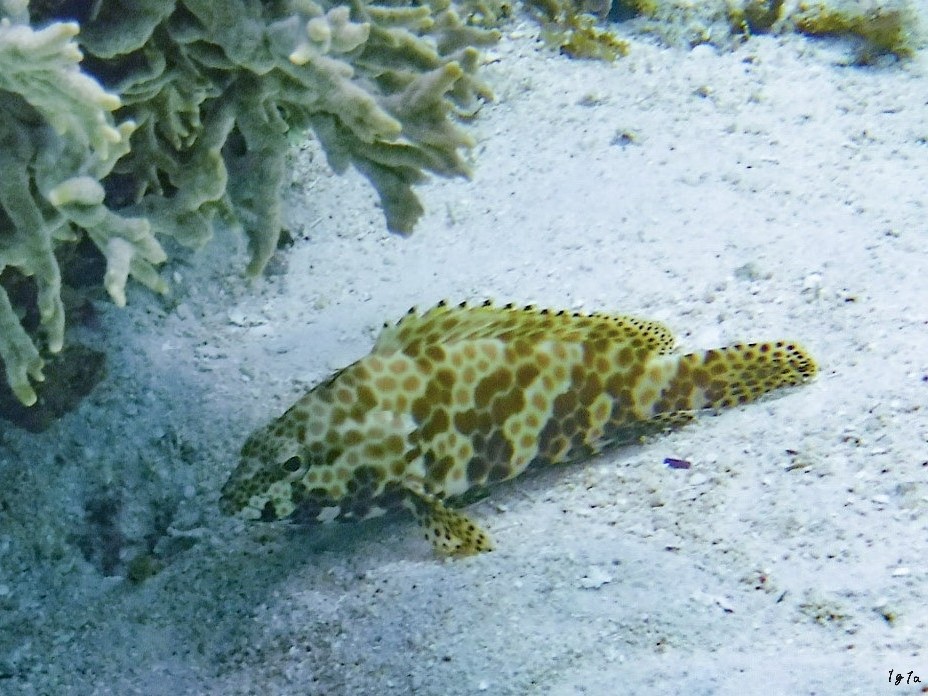 英名ではハニカムグルーパー。「Honeycomb」=「蜂の巣」に模様を見立てています。