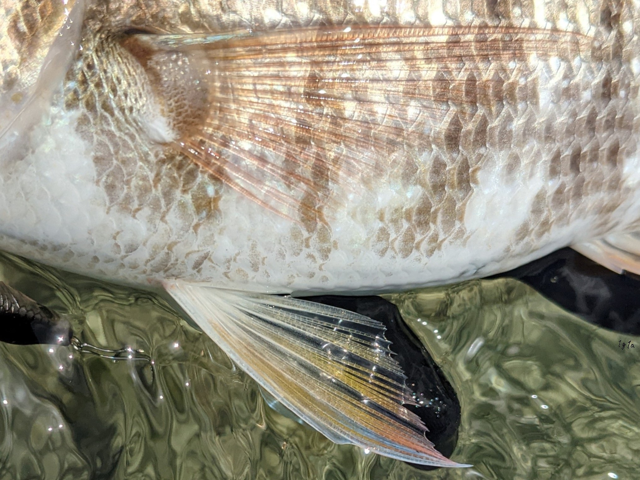 フエフキダイ系の魚らしく厚い唇を持っているので、針掛かりはしっかりしている方。浮かせる際に短く突っ込み、竿をゴンゴンと叩きます。最後の抵抗にもテンションを抜かずにキャッチしましょう。